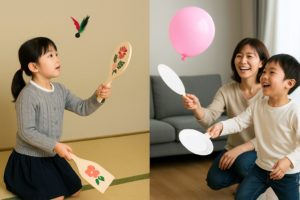 羽根つきはもともと羽子板と羽根を使って遊ぶ、ラケット遊びのようなものです。現代風にするなら、屋内でも遊べるように「風船」や「布製の羽根」を使ってみましょう。