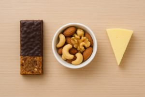 【間食】:プロテインバー、無塩ナッツ、低脂肪チーズ