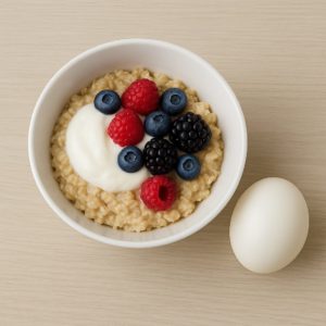【朝食】:オートミール+無糖ヨーグルト+ベリー、ゆで卵1個